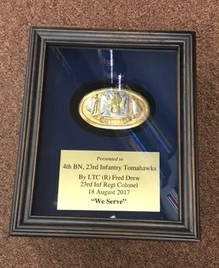 HCOR Drew presents Regt Certificate to LTC Mike Taylor on the occasion of his taking command of the 2/23 Inf.