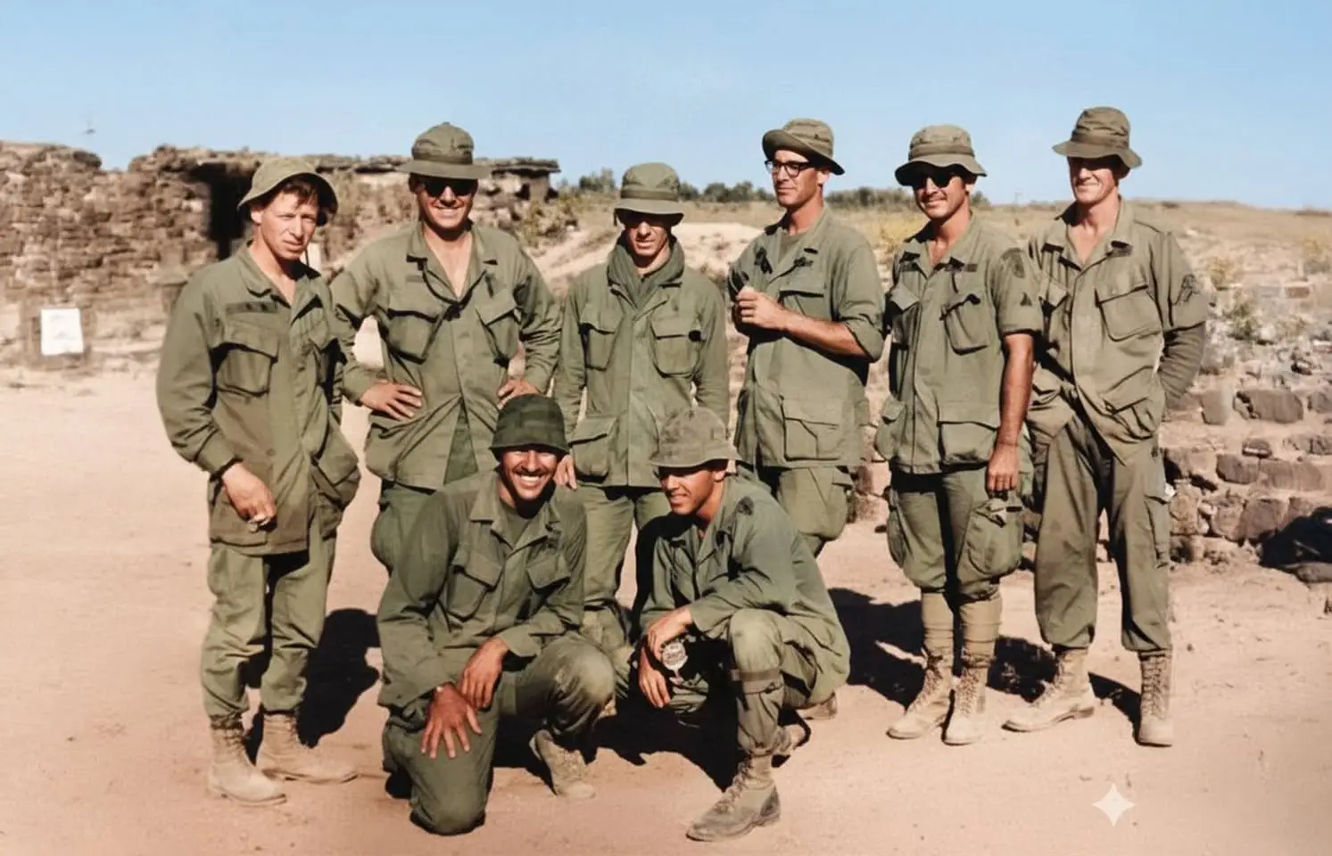 2nd Platoon, Bravo Co, 4/23 Mech Inf, Jan 12, 1970: L to R: Craig Andresen,Mark Rudolf, Glenn Patasic,Chris DeYoung,Lee Van Cong,Bill Kiley &Jim Lester.